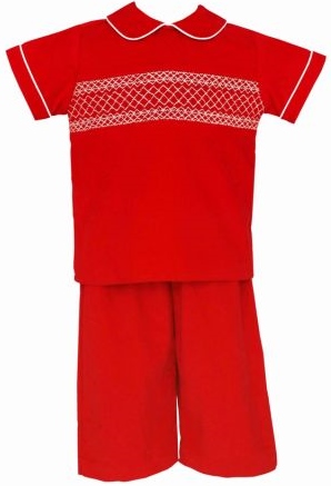 Red Corduroy Hand Smocked Short Sleeve Collared Shirt with Elastic Waist Pants