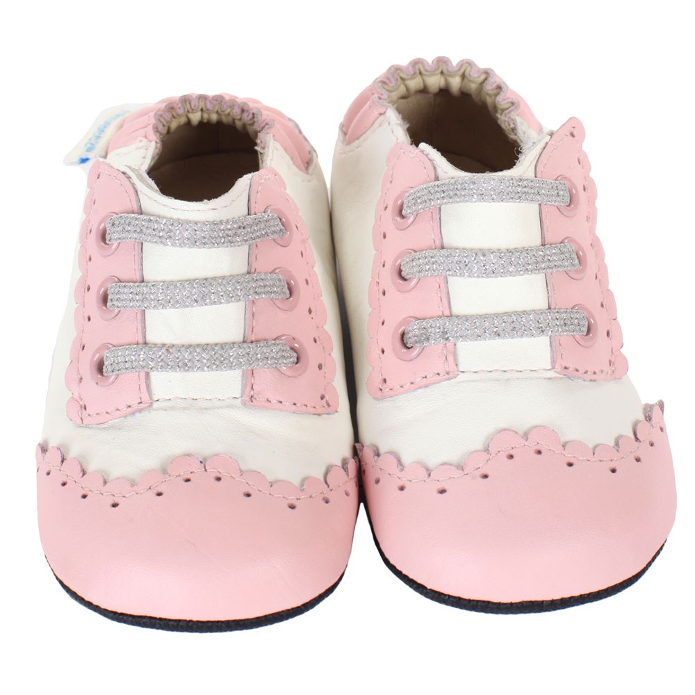 She'll be super stylish this Spring in her Olivia oxford. A two-tone white and pink leather upper combined with scallop detail gives this shoe a girly feel. The upper opens and closes on both sides of the shoe giving it easy-on functionality. And, don't miss the sparkly faux laces. This Mini Shoe has a non-skid, rubber outsole and an elasticized ankle to provide protection and comfort.